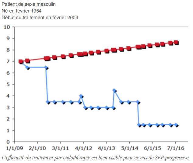 Le schéma suivant compare l’état des malades atteints de SEP traités par les traitements classiques (courbe rouge) à celui d’un homme atteint de SEP qui a bénéficié de l’endothérapie sur une période de 7 ans (courbe bleue). L’échelle de référence est le déficit fonctionnel, qu’on appelle aussi score EDSS. Le score va de 0 (pas de déficit neurologique) à 10 (décès du malade).