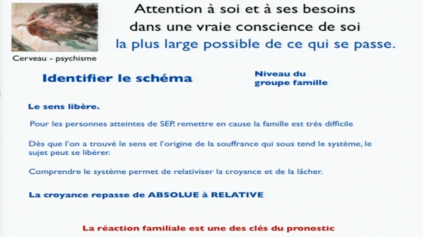 Autrement dit, le « soi » se met à se défendre comme s’il était attaqué par un « non soi » ! Or, pour ce faire, on observe qu’il attaque la myéline et non le nerf lui-même. Il attaque donc ses « cellules nounous » ; symboliquement, on peut y associer l’environnement, l’éducation ou un « héritage » au sens large, pas forcément génétique… J’en suis ainsi arrivé à conclure que le sujet exprimait biologiquement par la SEP ce qu’il n’arrive pas à conscientiser !