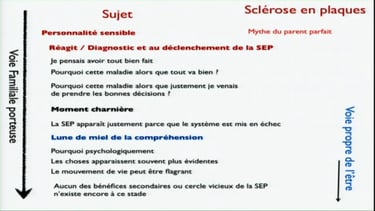 NDLR : Les symptômes tels que les troubles du sommeil (insomnie, hypersomnie, consciemment ou inconsciemment : je me sens seul et sans défense"), la dépression (perte de projet pour soi-même), la constipation (peur de lâcher ses valeurs, volonté de maîtrise sur sa vie avec peur des épreuves du passage à la maturité) et les infections urinaires (menace dans son territoire) sont associés à un diagnostic de sclérose en plaques cinq années plus tard et perdurent souvent après.